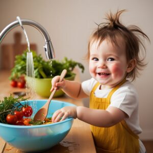 - Washing veggies: One appropriate tool that can be used by parents to involve kids indoors in cooking is water. This idea could be carried out either in the kitchen or outside, such as in the backyard. Most importantly, the child enjoys both the task and the game. Furthermore, water and the dirt or soil from fruits and vegetables go down the drain, thus, the kitchen can be kept clean and organized